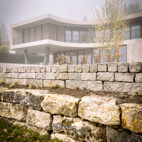 Winkelhaus is the inaugural project of estudio kmmk in Switzerland. The single-family home was shaped by its stunning natural surroundings and its regional context. The house forms a harmonious relationship with the adjacent forest and expansive valley. Its curved design orients all interior spaces toward the setting, allowing the inhabitants to experience both the architecture and its context through all four seasons. The landscape concept integrates the building into the natural terrain, creating the impression that it has always belonged to this very place. The exterior material palette reinforces this dialogue: textured bronze windows allow light to shift in color—a homage to the autumnal tones of the forest—while natural, hand-worked stone slabs reference local Roman ruins, acknowledging the region's historical layers. In contrast to the raw exterior materials, the interiors are intentionally restrained: seamless white floors, white-washed natural wood surfaces, and white plastered walls and ceilings. This composition, filled with abundant daylight, generates a peaceful atmosphere and directs focus toward the astonishing views of the valley and nearby forest.